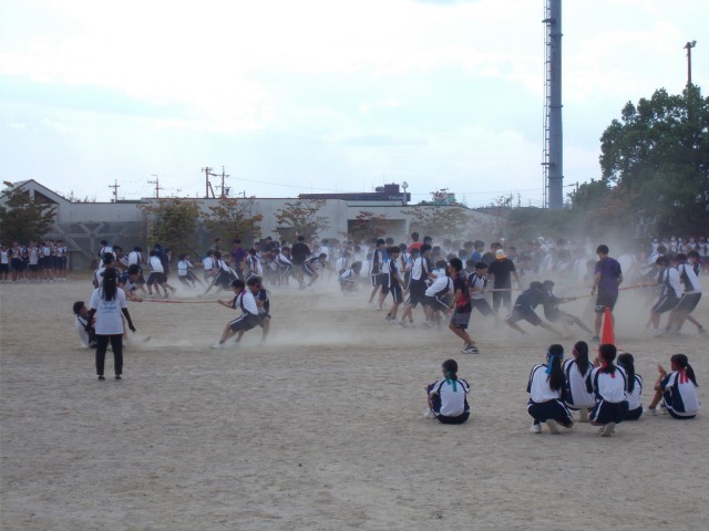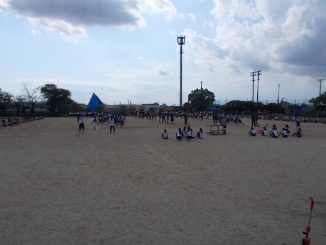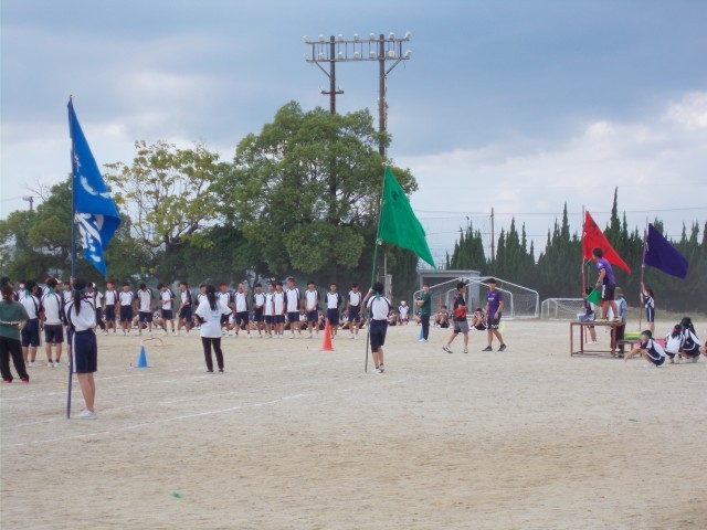 今年の東中体育大会では4つの団に分かれて競い合います。運動場に生徒たちの元気な声が響いています。教室の姿とは少し違った、生き生きした様子がみられています。