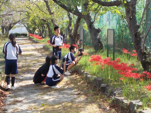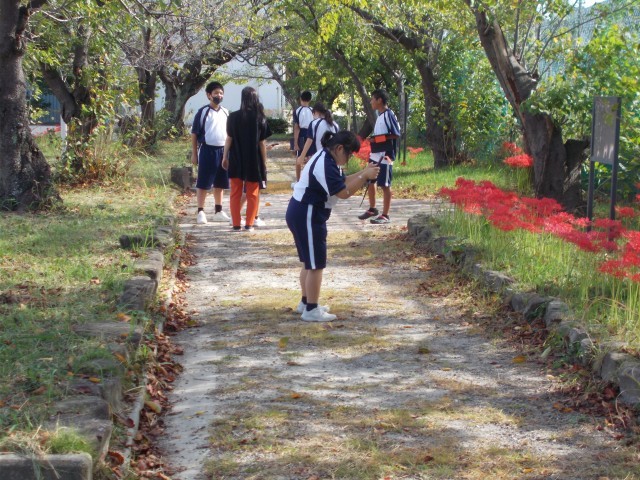 満開のヒガンバナや実り始めたドングリをみながら、季節の移ろいを体感しました。タンポポの綿毛に歓声をあげたりする生徒もいました。