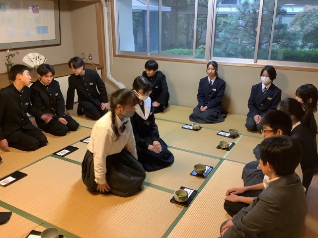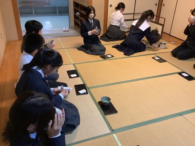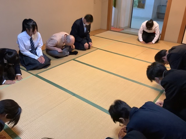 とてもおちついた所作をみせてもらい、とても空間がゆったりと落ち着いたものになっていました。参加した生徒たちの多くは正座に慣れていないため、茶会後しばらくの間は立って歩けなかったことは、毎年見られる光景です。