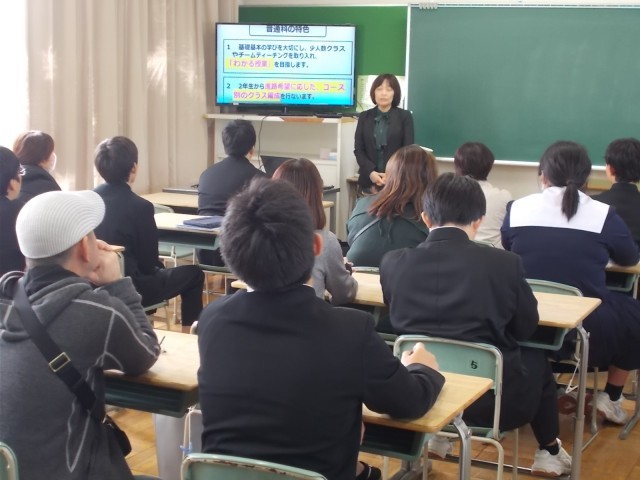 4校の近隣公立高校の先生方に来校いただき、具体的で詳細な各校の様子をお話しいただきました。2校を選んで話を聞きに行くブース型で今回実施しました。各会場は少人数となるため、高校の先生方のお話をより集中して聞くことができました。メモをとりながら聞く様子も見られました。