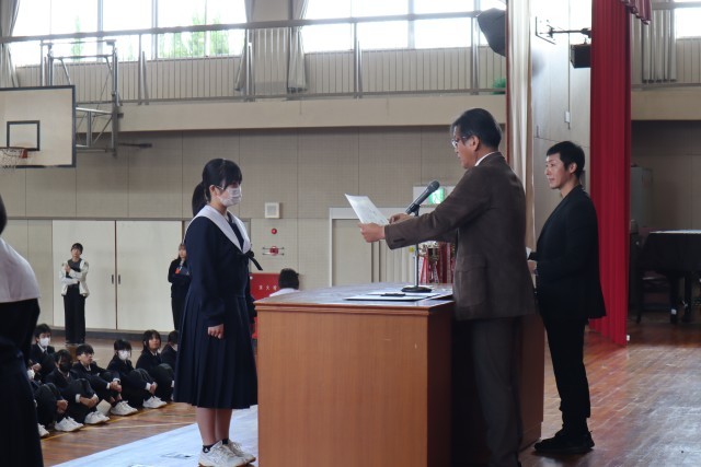 今回の集会では、絵画や作文や発明くふう展といった多くの作品募集での入賞や、秋季の部活動などのスポーツ面での東中生の活躍がめざましく、とても多くの生徒が表彰をうけていました。努力やがんばりが入賞という形で認められたことは、とてもすばらしいことです。全校生徒も、表彰生徒を大きな拍手で讃えていました。