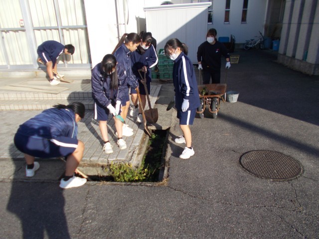 3年生が校内のふだんなかなか手が回らない箇所を徹底的にきれいにするという活動を計画しました。各クラスで分担し、6時間目の時間におこないました。クラブハウスや校内各所の側溝、非常階段など、時間をめいっぱい使ってきれいにしてくれました。