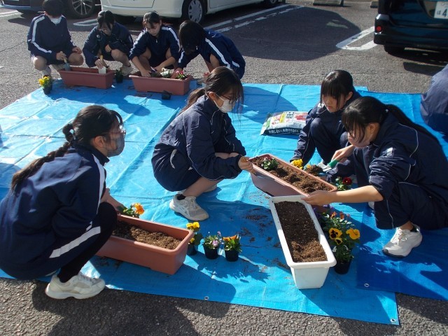 好天に恵まれ、鷲塚公民館にて花植えボランティアが行われました。