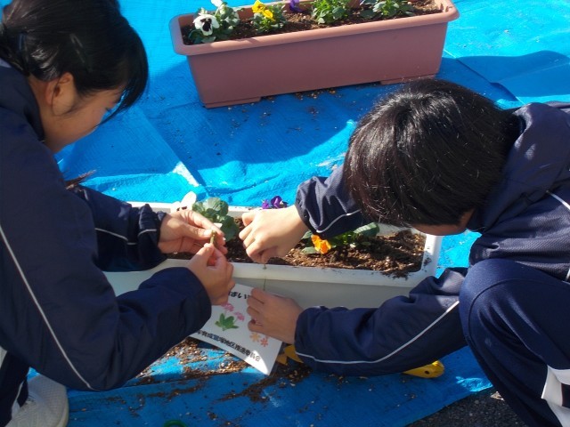 最初に青少年育成委員の方から作業上のレクチャーを聞いて、作業に取り掛かりました。みんな楽しそうに作業を進めていました。完成したプランターは鷲塚地区の区民館や保育園などに飾られます。
