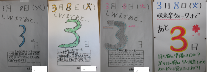 カウントダウンカレンダーをふと見ると、LWまであと3日となっていました。今までのLW集会や学級での取り組みを見ていても、「行事に向けて成長する」ことが感じられます。2年生の掲示板には、昨年度の経験から1年生へ熱いメッセージが載っていました。1年生の行事だけれども、全校が応援していることが本当にうれしいですね。1年生のみんなですばらしい行事にしましょう!!