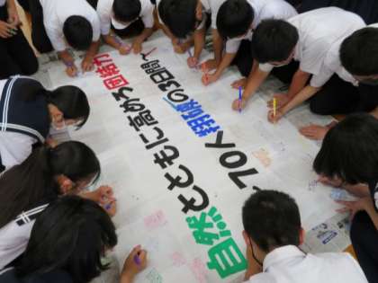 3日間の思い出を写真で振り返り、成長や思いを語りました。また、語り切れなかった思いは、スローガン旗に書き込みをして、学びのまとめとしました。