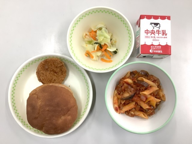 サンドイッチバンズパン、牛乳、とんカツ、キャベツソテー、ペンネとなすのトマト煮