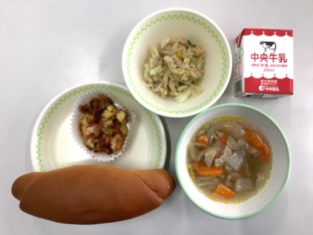 クロロールパン、牛乳、鶏肉とさつまいものマヨネーズグラタン風、野菜ソテー、根菜スープ