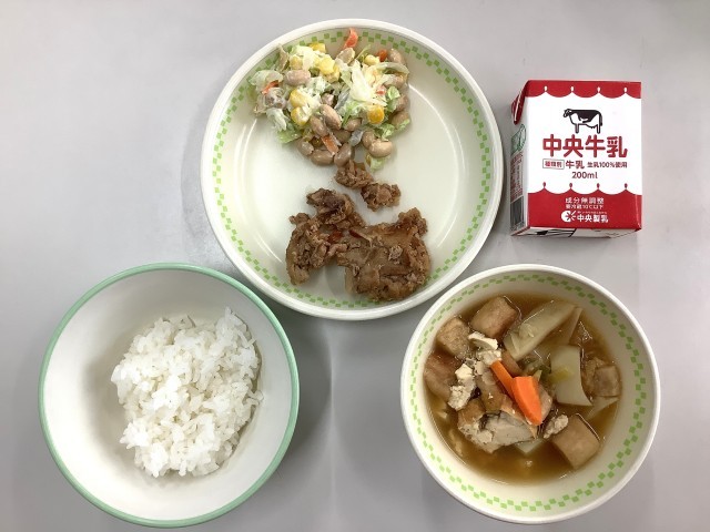 ご飯、牛乳、豚肉のいちじくソース(豆乳バター使用)、大豆サラダ、焼き麩汁、ノンエッグマヨネーズ