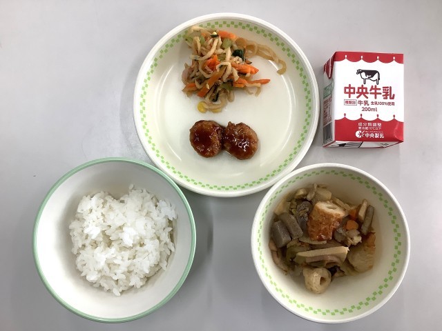 ご飯、牛乳、白ごまつくね、筑前煮、切干大根のさっぱりあえ