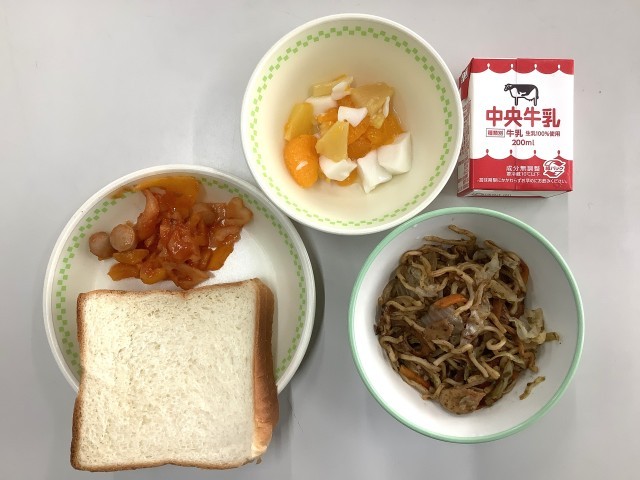 スライスパン、牛乳、焼きそば、ウインナーとれんこんのチリソース煮、アンニンドーフ
