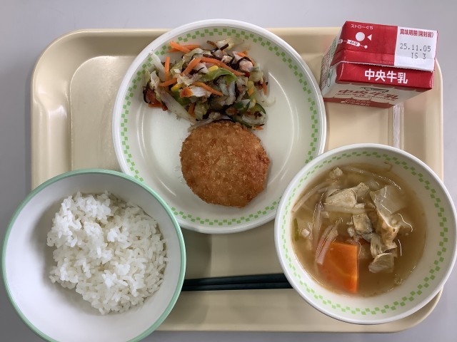 ごはん 牛乳 エビカツ りっちゃんのサラダ 湯葉のすまし汁