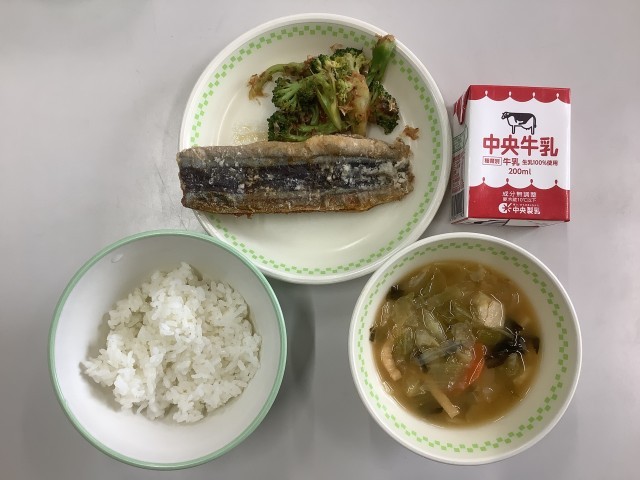 ご飯、牛乳、さんまの蒲焼き、ブロッコリーのおかかあえ、呉汁