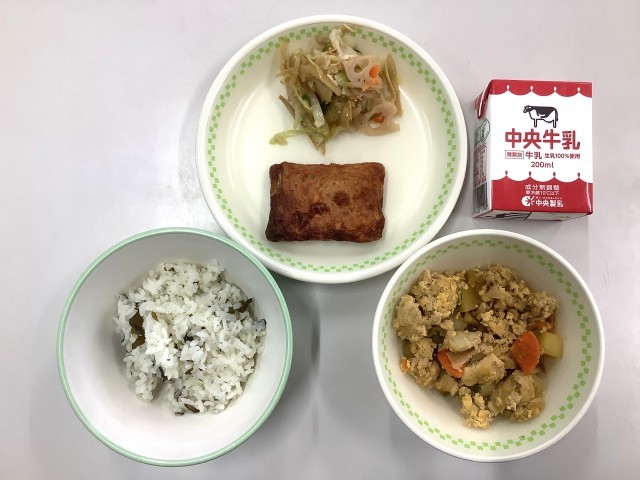 わかめご飯、牛乳、焼きはんぺん、高野豆腐の卵とじ、根菜サラダ