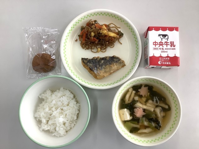 ご飯、牛乳、さわらの塩唐揚げ、さつまいものきんぴら、紅葉のすまし汁、西尾抹茶のわらびもち