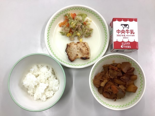 ご飯、牛乳、鶏肉のマヨ白しょうゆ焼き、みそ煮、野菜の塩こうじ炒め