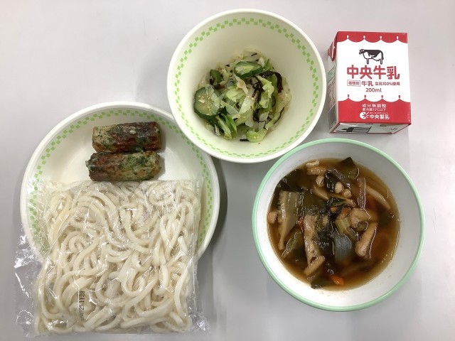 白玉うどん、牛乳、きのこうどんの汁、ちくわの磯辺揚げ、塩昆布あえ