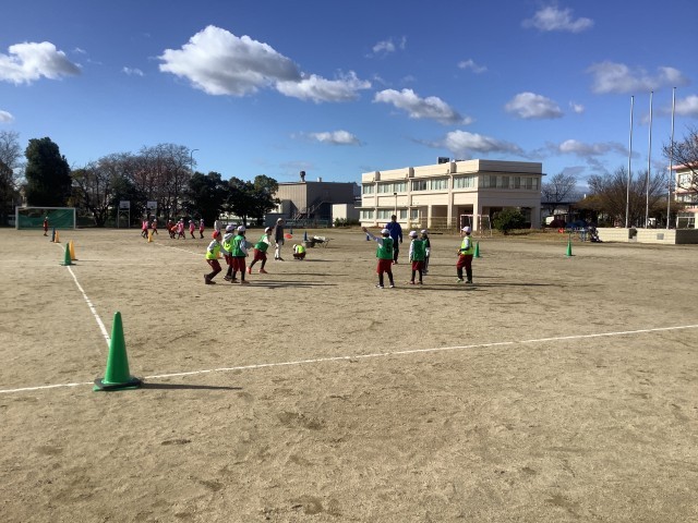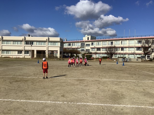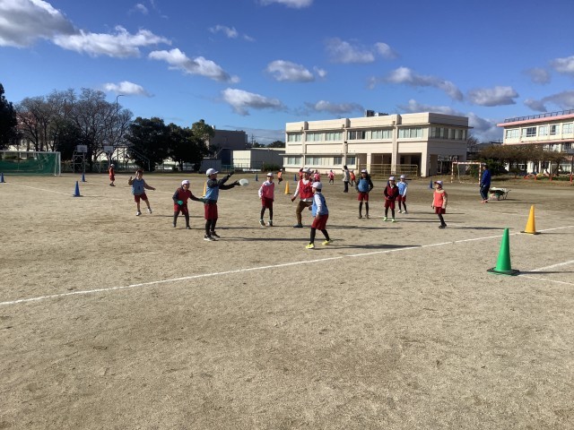 12月15日(月)、4年東組が体育の授業でフライングディスクのゲームをしている様子です。