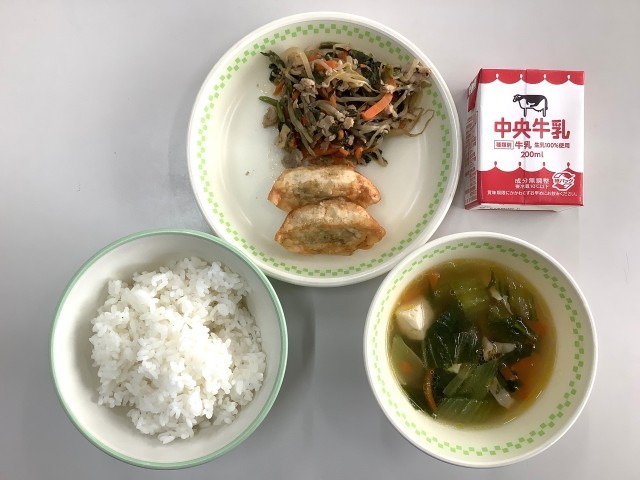ご飯、牛乳、ビビンバ、揚げぎょうざ、豆腐とチンゲンサイのスープ