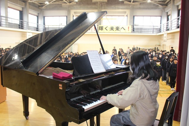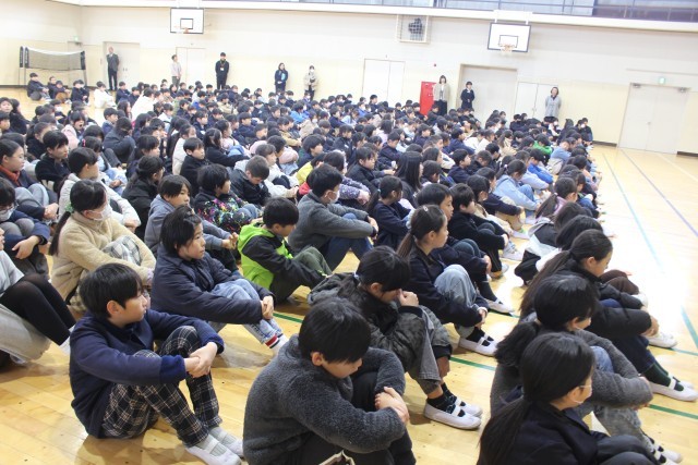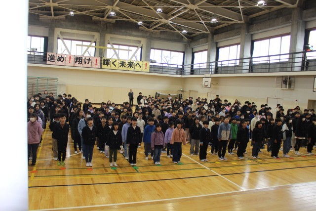 1月7日(水)、体育館で3学期始業式を行いました。全校で校歌を歌いました。3学期もがんばりましょう。