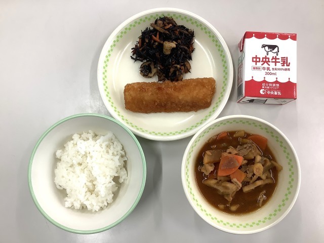 ご飯、牛乳、いかフライのレモン煮、ひじきのいため煮、根菜の豚汁