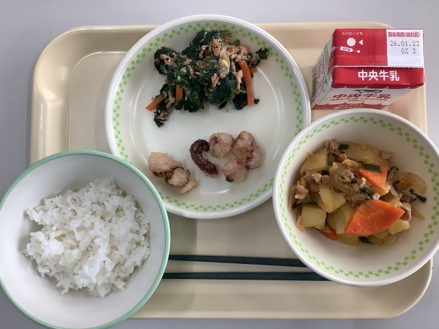 ご飯、牛乳、たこのから揚げ、韓国風肉じゃが、ほうれん草のナムル