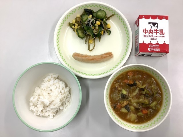 麦ご飯、牛乳、ウインナー、愛知の冬野菜カレー、白だし海藻サラダ