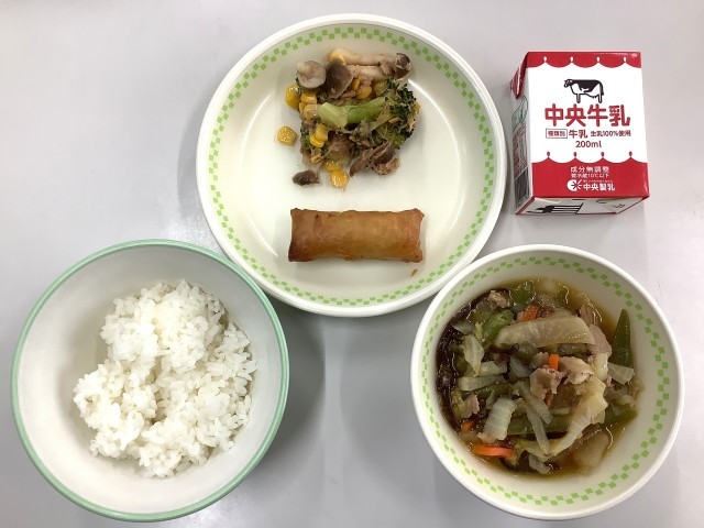 ご飯、牛乳、春巻、豚肉と大根の中華煮、ブロッコリーのオイスターソース炒め