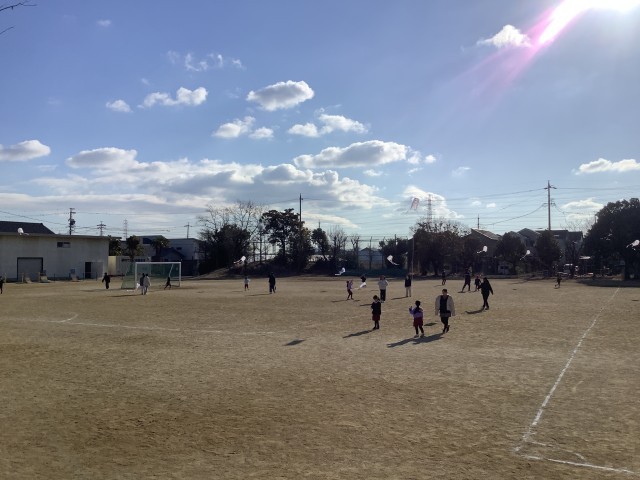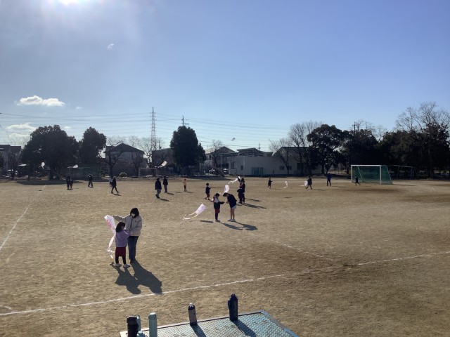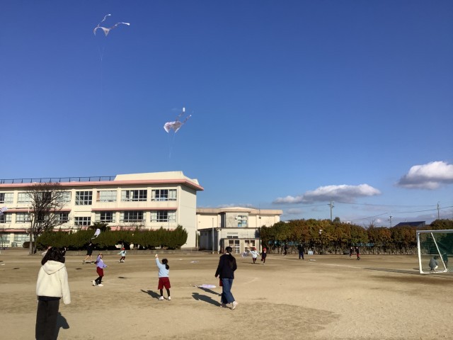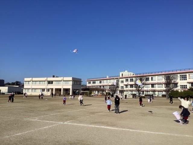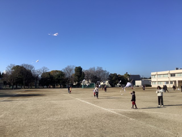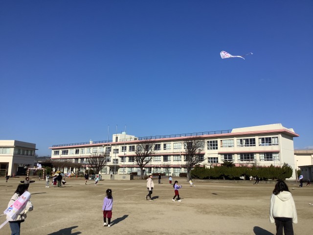 2月2日(月)1時間目、1年西組と6年西組がペア活動で凧あげを行いました。6年生の子たちが1年生の子たちのサポートをして凧をあげていました。