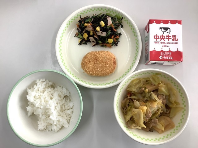 ご飯、牛乳、肉丼、おからコロッケ、ひじきと野菜のあえもの