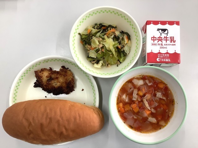 ロールパン、牛乳、鶏肉のパン粉焼き、春キャベツと菜の花のペペロンチーノ風ソテー、ミネストローネ