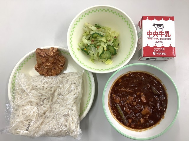 ソフトめん、牛乳、肉みそかけ、たこちゃん揚げ、彩りあえ