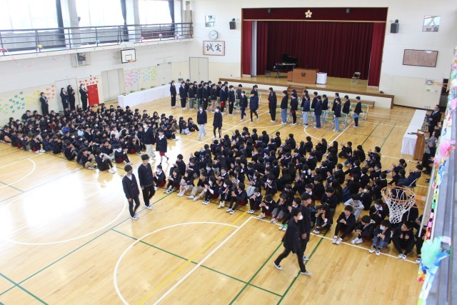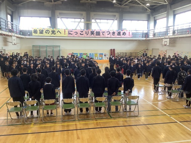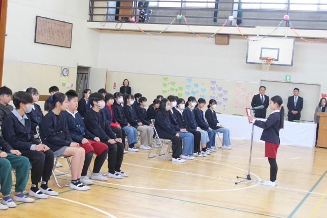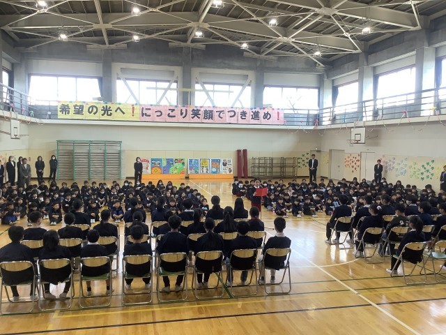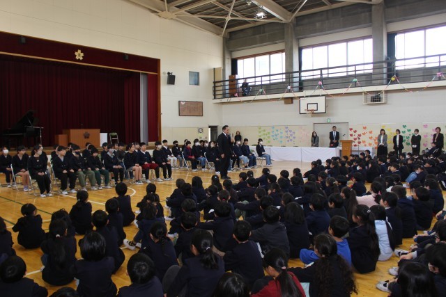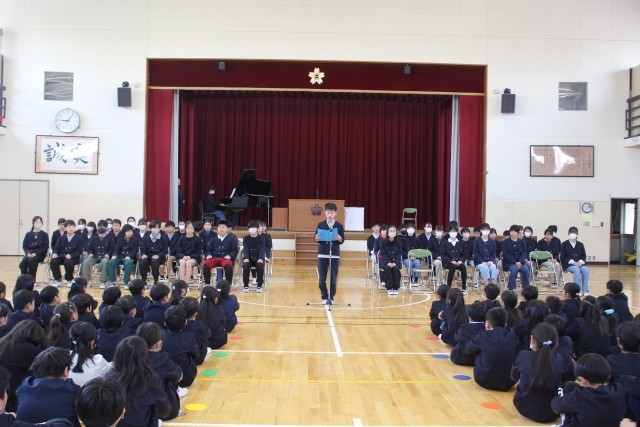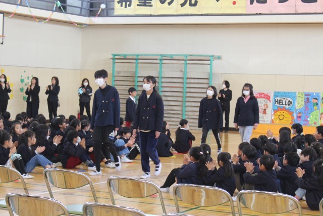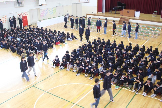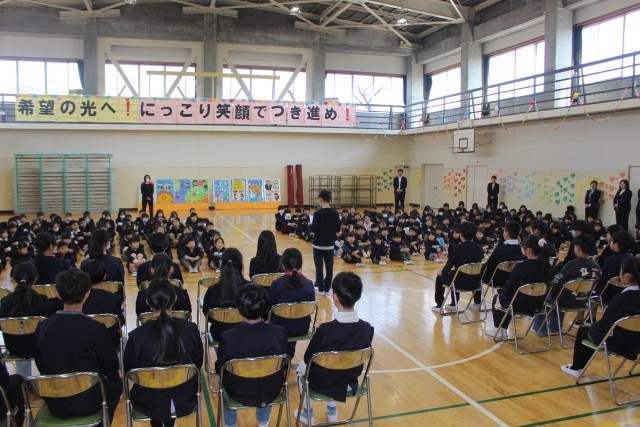 3月18日(水)1時間目、1~4年生と6年生が、「お別れ式」を行いました。1~4年生が、6年生にお別れを伝える最後の機会でした。一緒に歌った校歌が体育館に響き渡っていました。