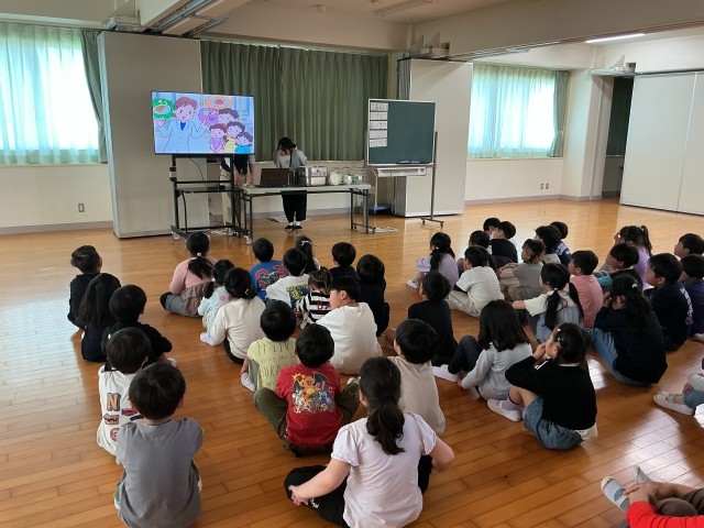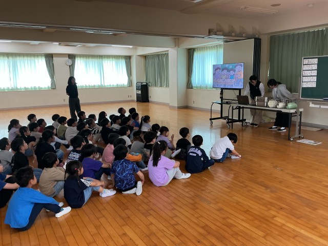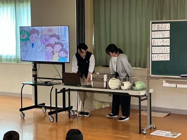 4月20日(月)3時間目、1年生が「給食についての説明会」で給食の配膳の仕方や片づけ方、食べ方などのお話を聞きました。