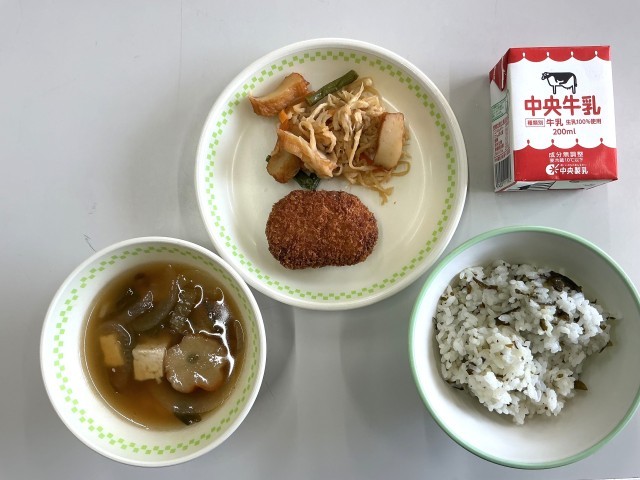 わかめご飯、牛乳、キャベツ入りメンチカツ、切干大根の煮物、花ふ汁