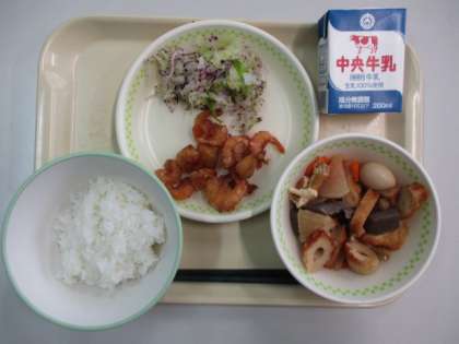 (献立メッセージ)寒い日が続くと、温かい食べ物で体も心もぽかぽかにしたいですね。大阪などに関西地方では、おでんのことを関東煮と呼びます。しかし、東京などの関東地方のおでんと関西地方のおでんは少し味付けが違っています。関東はしょうゆを多く使ってやや塩辛いのに対して、関西はしょうゆが少なく少し甘めです。おでんの食べ比べをしてみるのも楽しそうですね。