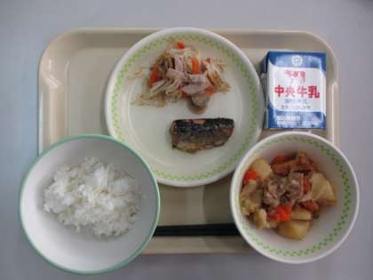 (献立メッセージ)今日はさっぱりサラダにゴボウが入っています。ゴボウを野菜として食べてきたのは世界中で日本だけです。しかし、最近ではゴボウの味や香り、シャキシャキとした歯ごたえから、フランス料理やイタリア料理でも使われるようになってきました。ゴボウには食物繊維がたくさん含まれており、おなかの調子を整えたり血液がドロドロになるのを防いでくれたりします。ゴボウの味や香りを楽しんでください。