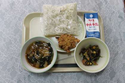 きつねうどん(白玉うどん)、かわりかき揚げ、こんにゃくソテー、牛乳
