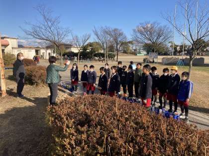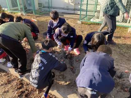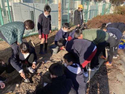 放課後、美化・エコ委員の子どもたちが、けやき広場の植え込みにチューリップの球根を植えてくれました。春になって、きれいに咲き揃うのが楽しみです。ありがとう。