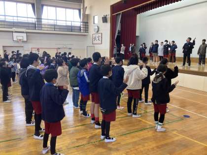 そのあとは、歌声委員のみなさんによる、今月の歌「君をのせて」の練習と、運営委員さんからの今月のめあての紹介でした。今月は「みんなで力を合わせよう」と「交通ルールを守ろう」です。6年生を送る会に向けて、みんなで協力して準備をすすめていきましょう。