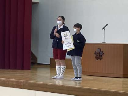 はじめに、先日新聞にも掲載された、「全国少年少女チャレンジ創造コンテスト」で全国2位に入賞した男子児童を、みんなで祝福しました。
