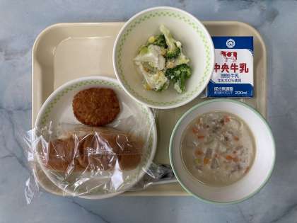 牛乳、愛知の米粉パン、エビカツ、根菜シチュー、花野菜サラダ
