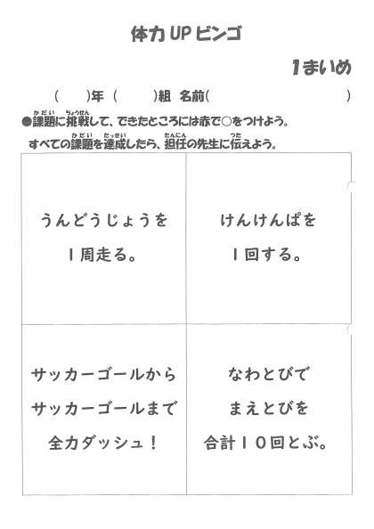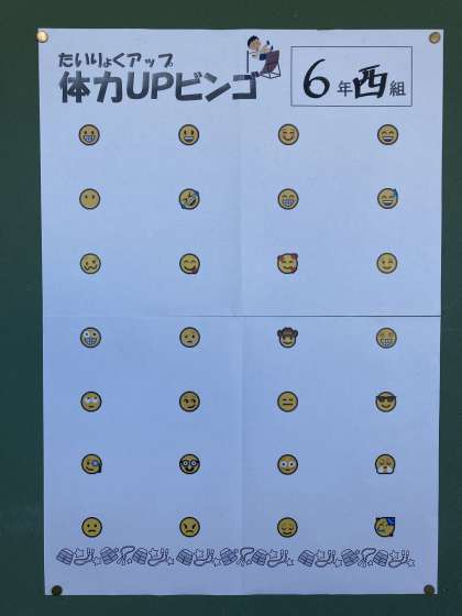 今日から、体力UP週間が始まります。ビンゴが3枚準備してありますので、みんなで励まし合いながら、少しでも体力づくりに励みましょう。筋肉シールをたくさん貼れるといいですね。