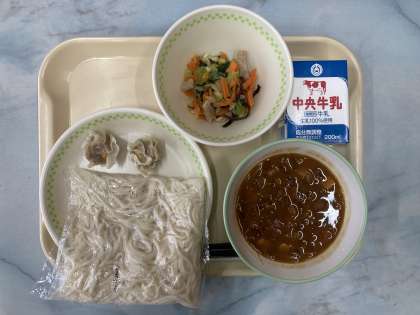 牛乳、ソフト麺、かんぱちそぼろ入りジャージャー麺の具、コーンシュウマイ、野菜の中華炒め