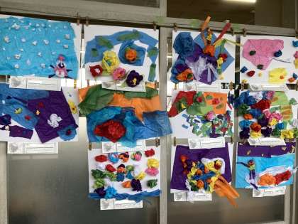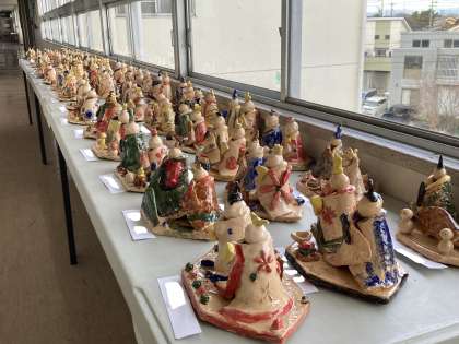 今日も、教室前の廊下に子どもたちの作品が掲示してありました。5年生の廊下には、2学期に作ったひな人形の土人形が焼き上がっていました。カラフルなひな人形がすてきです。