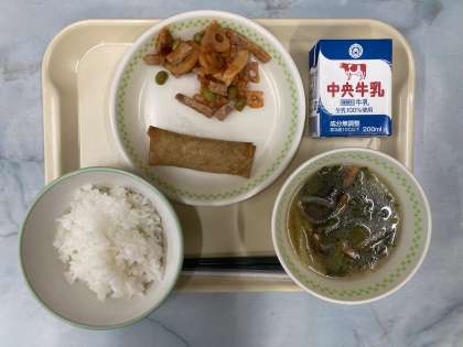 牛乳、ご飯、春巻き、れんこんのチリソース煮、チンゲンサイの中華スープ