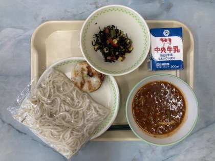 牛乳、ソフト麺、大豆入りミートソース、シーフードステーキ、ひじきと野菜のソテー