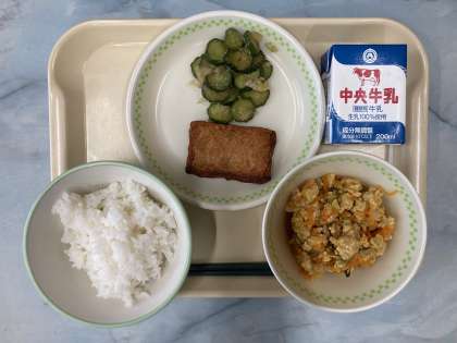 牛乳、ご飯、碧南どんぶり、野菜はんぺん、やみつききゅうり