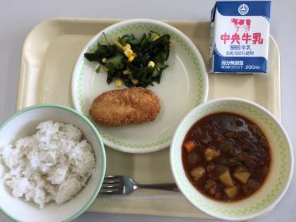 今日の献立 麦ご飯、えびカツ、ハヤシシチュー、海藻サラダ、あおじそドレッシング、牛乳