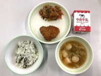 ご飯、牛乳、碧南どんぶり、野菜はんぺんのてん茶風味、じゃがいものしゃきしゃき炒め